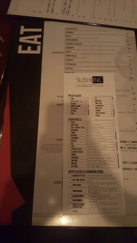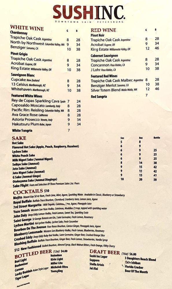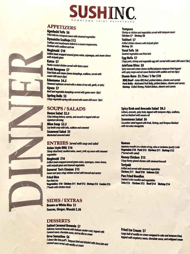 Welcome to Sushi Inc, your go-to destination for an exquisite Asian fusion experience in St. Petersburg, FL. Located conveniently at 270 1st Ave N, this delightful eatery redefines Japanese cuisine, offering an extensive menu that caters to everyone, including vegan options.